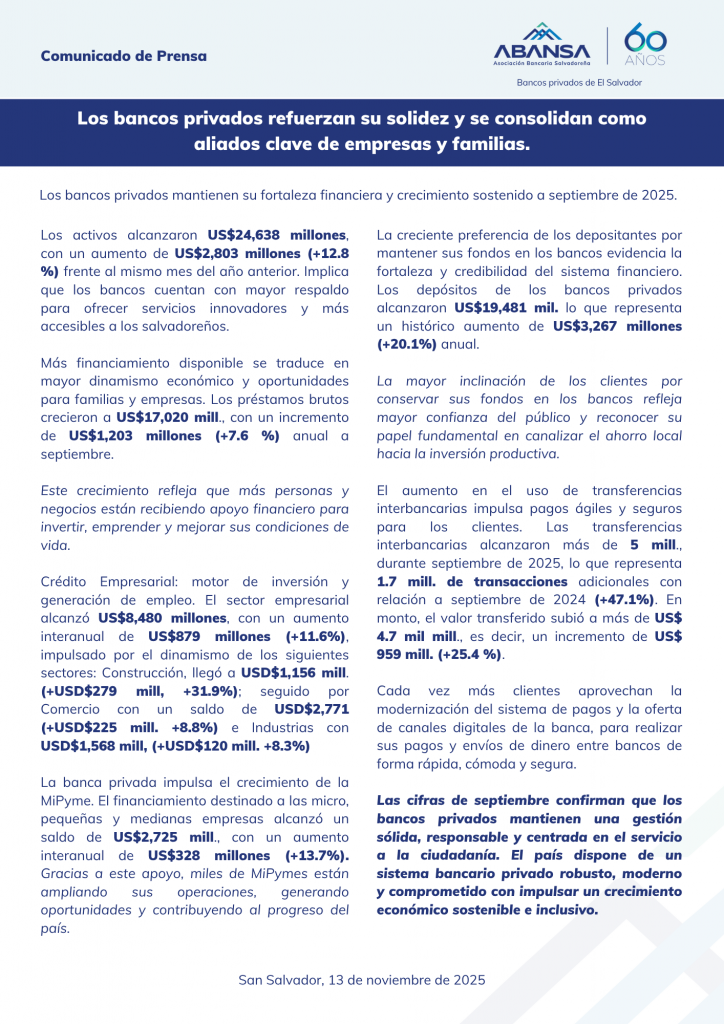Comunicado de prensa relativo al desempeño financiero de la Banca Privada del país.